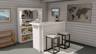 De bar met een wanddikte van 44 mm, uitgevoerd in onbehandeld vurenhout, is een sfeervolle en praktische toevoeging voor een tuinhuis. Deze houten bar biedt een ideale plek om te ontspannen, gasten te ontvangen of een gezellige buitenruimte te creëren.