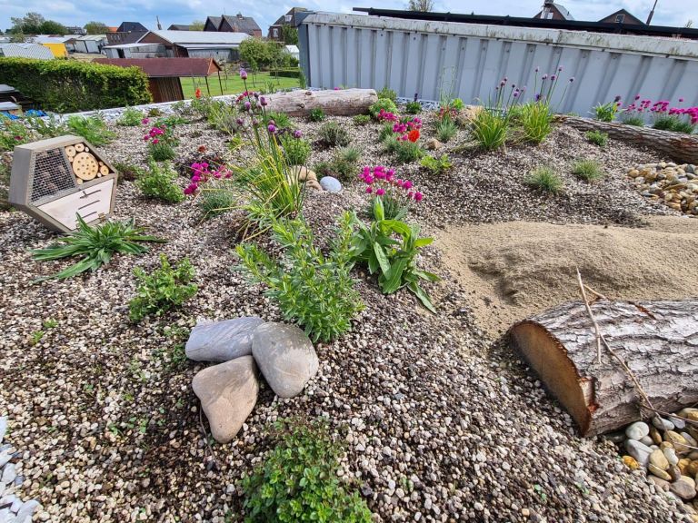 Het pakket is geschikt voor alle platte daken en daken tot 10 graden. Bij het pakket horen 4 sedummixmatten, 13 zakken daktuinsubstraat van 20 liter, 5 zakken zand, 5 zakken grind, 2 zakken pebblestones, 2 eiken boomstammen, 6 m² beschermdoek en het insectenhotel Beezzz ‘n Bio.