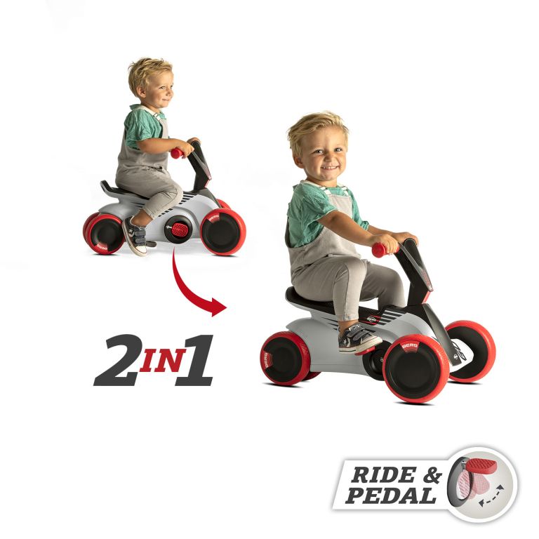 De BERG GO2 skelter is een meegroei stepfietsje of loopautootje, het is maar hoe je het noemen wilt, geschikt voor kinderen vanaf 1-2 jaar. Wanneer kleintjes net beginnen met het rijden op een vierwieler, hebben ze vaak nog niet genoeg motoriek, om pedalen rond te kunnen draaien. Omdat die in het begin, dan eigenlijk alleen maar in de weg zitten en ze er bovendien hun beentjes aan kunnen bezeren, zijn de BERG GO2 skelters uitgerust met een in- en uitklapbaar pedalensysteem. Zo leert het kind eerst ongehinderd steppen, waarna het later over kan gaan op fietsen.
