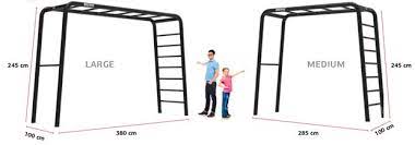 Het BERG Playbase frame is in twee verschillende maten verkrijgbaar. Gaat u voor het medium frame met een lengte van 285 cm of voor de grote variant van 380 cm. De diepte en hoogte van beide frames zijn gelijk, namelijk 100 cm diep en 245 cm hoog. Voor de zijkant van de frames kiest u uit drie mogelijkheden: twee duikelrekken, twee trappen of een duikelrek met trap.
