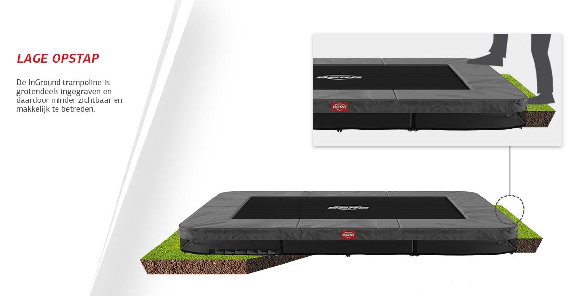 De Inground trampoline zorgt dat het springen extra veilig is voor iedereen. Hij staat laag bij de grond waardoor het op en afstappen erg makkelijk is. Hierdoor zullen de kinderen er ook sneller op gaan. Tevens staat de trampoline minder in het zicht in de tuin. Een voordeel voor zowel de ouders als de kinderen.