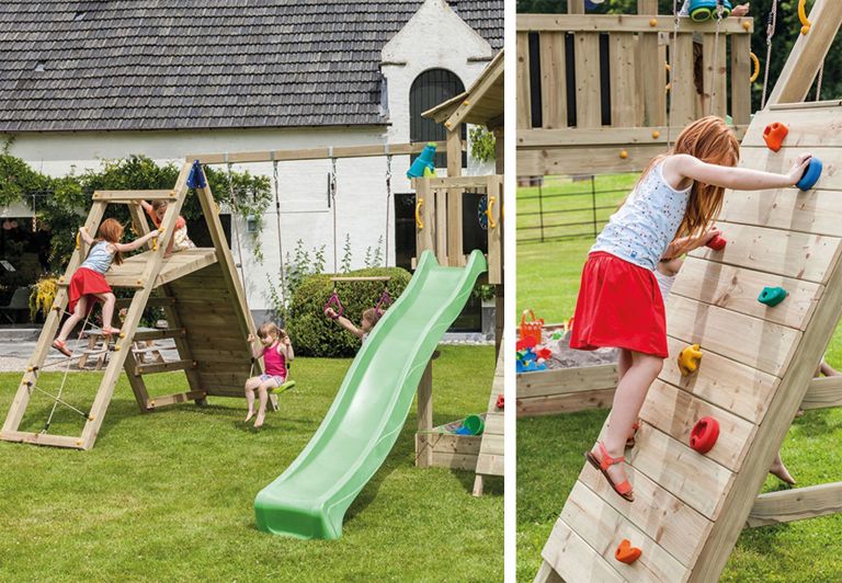 De module is opgebouwd uit een stevige houten constructie van hoogwaardig, geïmpregneerd vurenhout. Dit zorgt voor een lange levensduur en goede weerstand tegen weersinvloeden, waardoor het speeltoestel geschikt is voor langdurig buitengebruik. De set wordt geleverd als zelfbouwpakket, inclusief bouwtekening, bevestigingsmaterialen en diverse klimelementen.