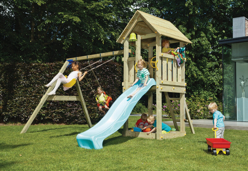 De set wordt geleverd als complete zelfbouwdoos met bouwtekening, bevestigingsmaterialen, handgrepen en grondankers. Daarnaast bevat de kit een houtpakket met stevige staanders, zodat je direct kunt starten met de opbouw van een stabiele en veilige constructie. Het speeltoestel wordt geleverd exclusief glijbaan, schommel en andere speelaccessoires, waardoor je de opstelling volledig naar wens kunt uitbreiden.