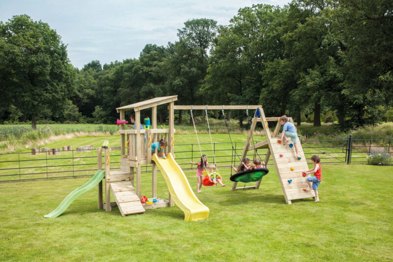 Dankzij de robuuste houten constructie en stevige stalen verbindingsdelen is de module geschikt voor intensief buitengebruik en bestand tegen verschillende weersomstandigheden. De solide opbouw zorgt voor een stabiele en veilige speelomgeving, ook bij dagelijks gebruik.