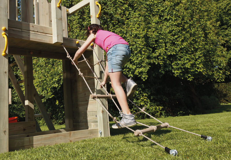 Het klimnet is gemaakt van sterk, weerbestendig synthetisch touw en biedt voldoende grip voor kleine kinderhanden. De constructie wordt ondersteund door houten of metalen verstevigingspunten, waardoor het geheel stabiel en veilig blijft tijdens intensief gebruik. De module is ontworpen voor langdurig buitengebruik en bestand tegen verschillende weersomstandigheden.