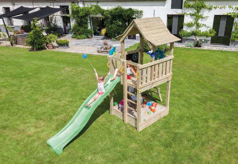 De constructie is gemaakt van stevig, geïmpregneerd hout en is ontworpen voor intensief buitengebruik. Dankzij de robuuste opbouw en solide verbindingen blijft de toren stabiel en veilig, ook bij langdurig en actief spelen in verschillende weersomstandigheden.