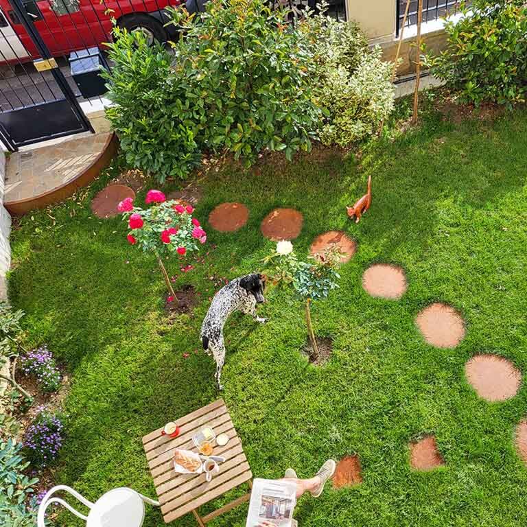 Deze staptegels, ook wel stapstenen genoemd, zijn gemaakt van cortenstaal die in eigen productie zijn gemaakt. Ze zijn eigenlijk overal in de tuin te plaatsen; in het grind, het gazon, tussen de planten of op een andere plek in de tuin. De staptegels worden neergelegd in de aarde of op het gazon. De grasmaaier kan er zo overheen.