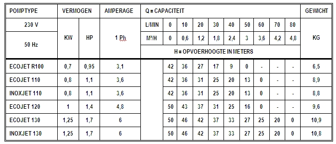 De ECOJET 130 wordt standaard als complete set geleverd met handvat, kabel, stekker, schakelaar en aansluitkoppeling. Heeft u behoefte aan minder vermogen? Dan zijn de R100-, 110-, 120-serie uitermate geschikt voor de klus. Deze beschikken over een kleinere venturi. De 110- en 130-Inoxjet serie is ook leverbaar met RVS pomphuis.
