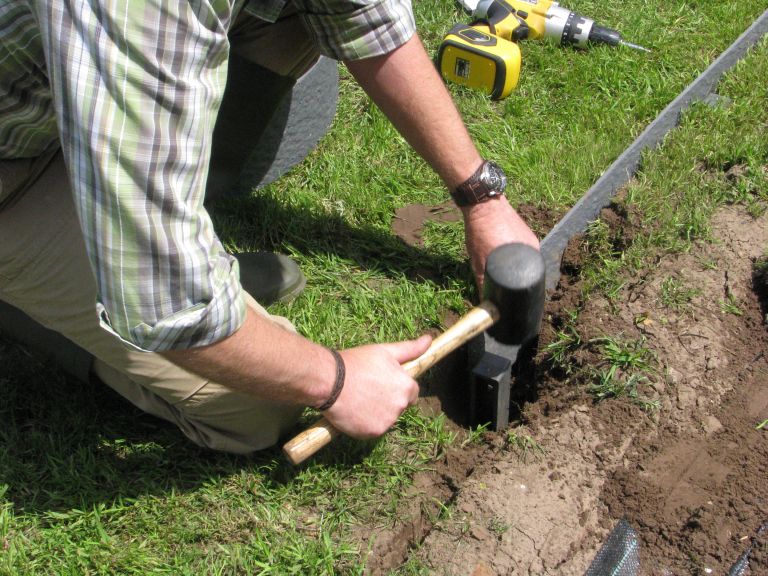 - Klop de Ecopic paaltjes om de 50cm verticaal in de grond. Breng hierbij de bovenzijde steeds op dezelfde hoogte.