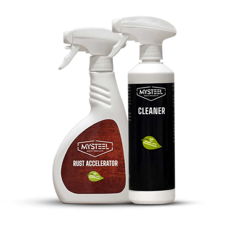 Cortenstaal heeft een olielaag die het oxidatieproces kan vertragen. De ontvetter verwijdert dit laagje snel en grondig. Daarna doet de Roestversneller PRO+ zijn werk: Dankzij de nieuwe PRO+ formule ontstaat de eerste roestvorming vaak al binnen één dag. Perfect voor wie snel resultaat wil, zonder wekenlang te hoeven wachten op natuurlijke verwering.
