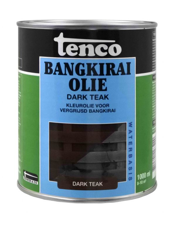 Tenco Bangkiraiolie dark teak is een kleurolie, speciaal ontwikkeld om vergrijsde objecten van bangkirai, zoals tuinvlonders, schuttingen, steigers, bruggen enz. in slechts 1 behandeling weer van een natuurlijke kleur te voorzien. De kleur dark teak geeft een warme donkere teakachtige kleur welke het bangkirai weer verlevendigt. Tenco Bangkiraiolie dark teak biedt op een eenvoudige wijze een prachtig resultaat. Dit uitstekende onderhoudsmiddel dringt diep in het hout en is waterafstotend. Oplosmiddelvrij, dus minder belastend voor het milieu.