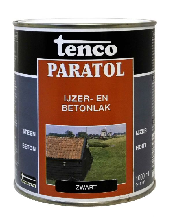 Tenco Paratol is een sneldrogende zwarte lak, het hecht direct op oude teer- en opgeruwde verflagen, ijzer, hout, steen en beton. Paratol is tevens een beproefd beschermingsmiddel voor metselwerk en betonnen funderingen die niet in contact komen met direct daglicht. Paratol is zuur- en alkalibestendig, is eenvoudig aan te brengen en gemakkelijk te onderhouden. Paratol is beperkt zonlichtbestendig, voor toepassingen in het volle zonlicht adviseren wij u gebruik te maken van de Tenco Houtcoat zwart of Tenco IJzercoat zwart.