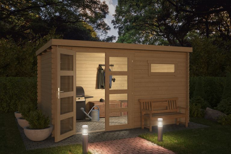 Tuinhuis Timian 380x230 cm onbehandeld Noord-Europees vuren is een duurzame en praktische keuze voor wie een stijlvol, functioneel en persoonlijk in te richten houten tuinhuis zoekt.