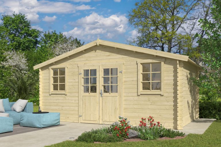 Tuinhuis Udo 480x300 cm onbehandeld Noord-Europees vuren is een ruim en praktisch buitenverblijf dat ideaal is voor wie extra opslagruimte of een werkplek in de tuin zoekt. Met een afmeting van 480x300 cm biedt dit tuinhuis voldoende ruimte voor tuinmeubelen, fietsen, gereedschap en seizoensartikelen, terwijl het tegelijkertijd een natuurlijke uitstraling behoudt die harmonieus in iedere tuin past.