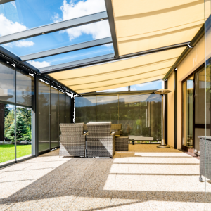 Naast verticale screens kunt u kiezen voor verandazonwering boven of onder het dak, bijvoorbeeld bij een glazen of polycarbonaat overkapping. Deze buitenzonwering houdt de warmte al tegen voordat die het terras of de serre opwarmt, waardoor de temperatuur aangenaam blijft op zonnige dagen.