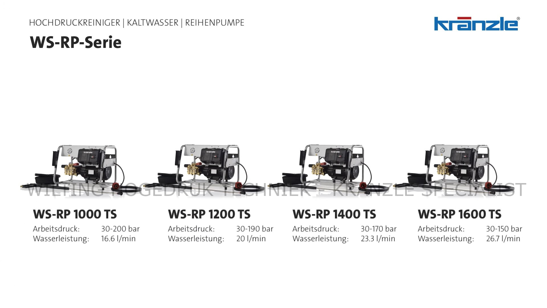Dit is de nieuwe professionele krukaspomp met geïntegreerde bypass en drukschakelaar. Deze stationaire hogedrukreiniger van Kränzle bied een professionele formule aan voor elk soort toepassing. Voor het gebruik van koud water zijn er 4 compacte modellen mogelijk. De bedrijfsdruk is traploos instelbaar. Er is een snelwissel-steeksysteem toegepast, om snel van lans te wisselen. Het totaal-stop systeem met vertraagde motoruitschakeling, is speciaal ontwikkeld voor deze WS RP serie om de motor en de hogedrukpomp te ontlasten. Deze 4 compacte modellen kunnen aan de muur bevestigd worden, in dat geval zijn er lanshouders voorzien. Deze WS RP serie is voorzien van een aansluitkabel van 7,5 meter lang inclusief een 32A stekker. Standaard zijn alle koudwater hogedrukreinigers uitgevoerd met snelkoppelingen en special draaikoppeling tussen slang en hogedrukpistool.